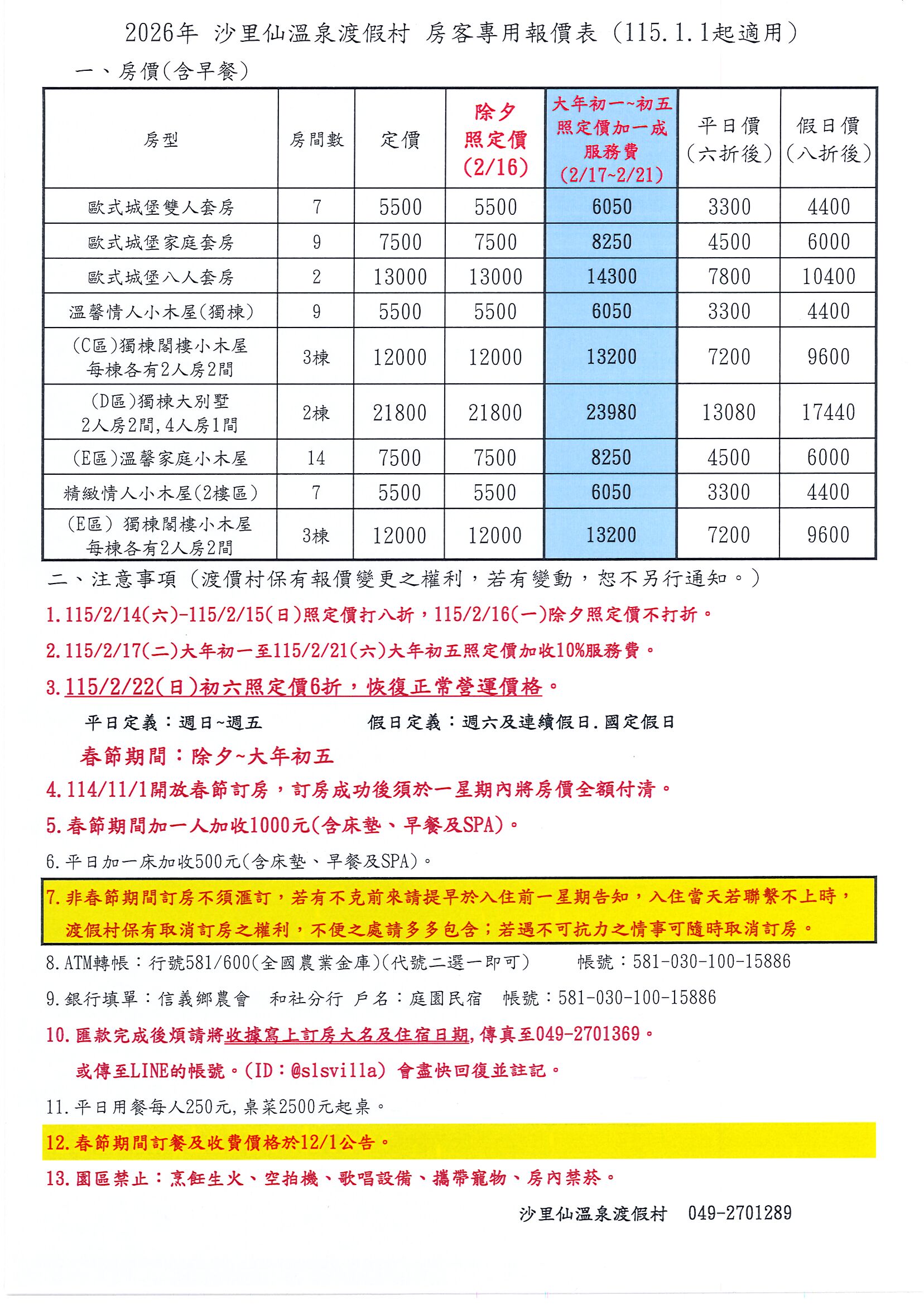 若有問題可來電詢問或 LINE官方帳號(LINE ID:@slsvilla)